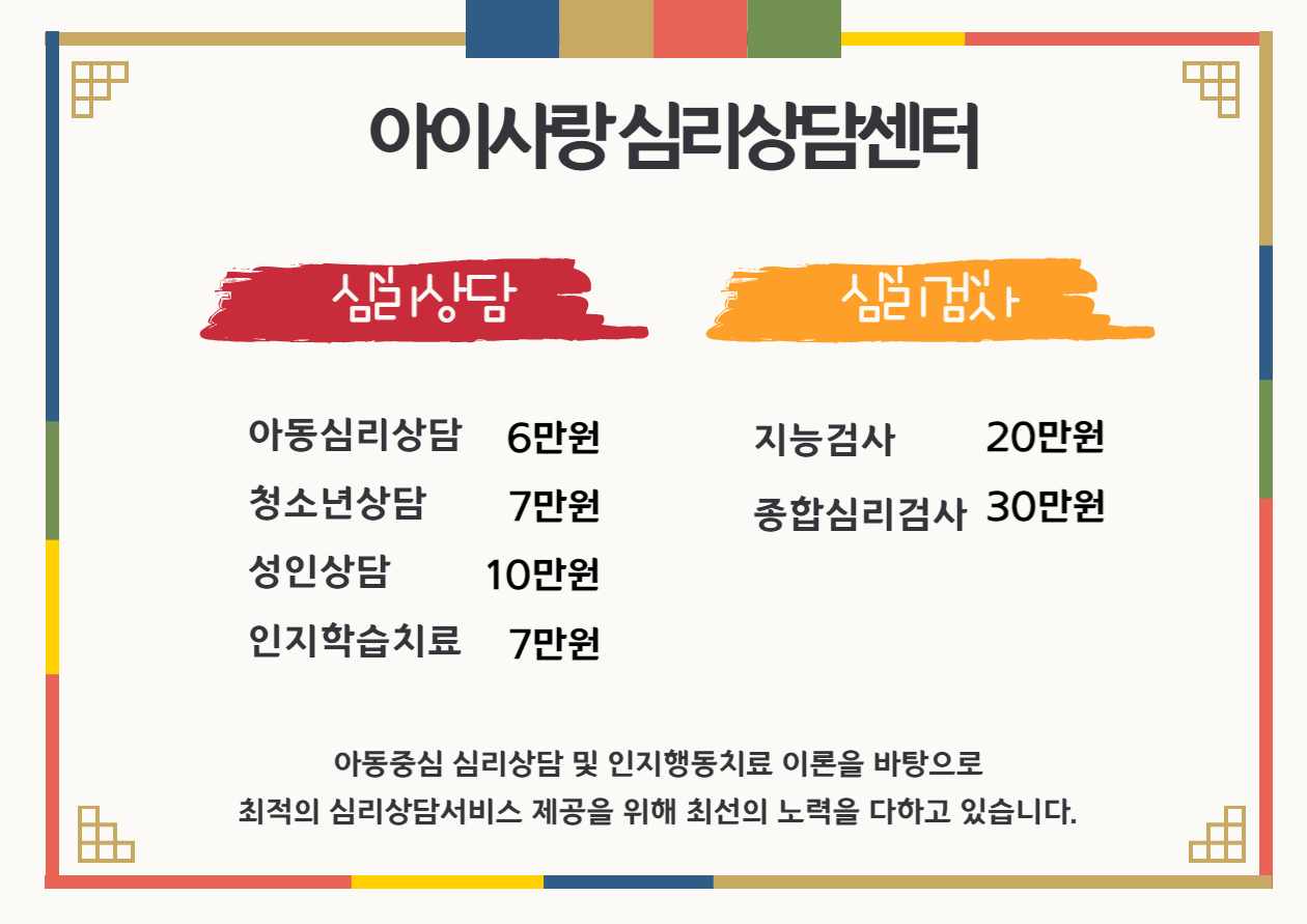 상담비용은 어떻게 되나요? 아동은 6만원 청소년은 7만원 성인은 10만원 인지학습치료는 7만원입니다. 아동은 초등학생까지, 청소년는 중·고등학생, 성인은 만18세 이상, 대학생 이상으로 분류하고 있습니다. 자주하는 질문 2023.04.02